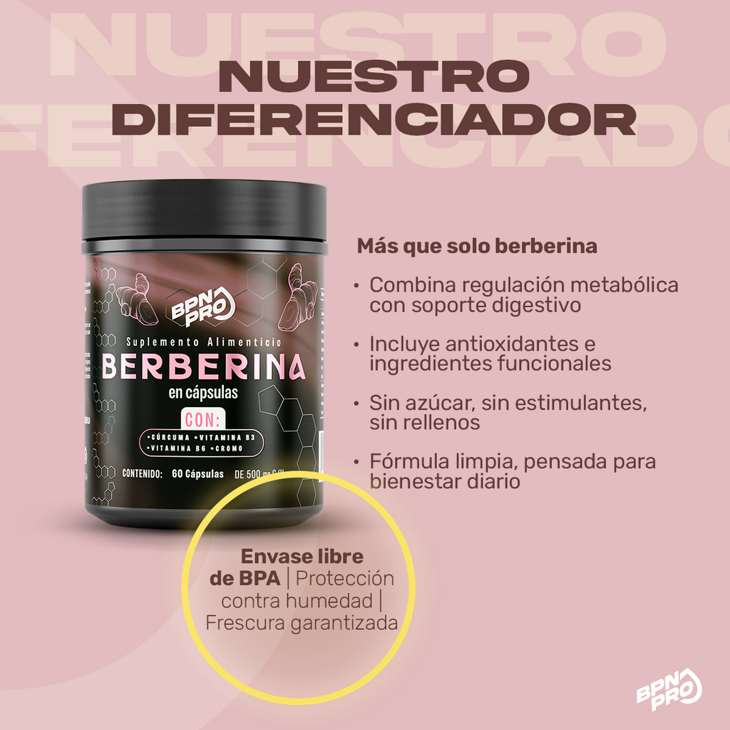 La Berberina BPN PRO combina cúrcuma, vinagre de manzana, canela, vitaminas B3 y B6, y cromo para apoyar el metabolismo, la salud cardiovascular, la regulación de los niveles de azúcar en la sangre y la digestión de forma natural. Su fórmula avanzada ofrece una opción práctica y efectiva para quienes buscan mejorar su bienestar integral. El Magnesio Complex BPN PRO combina cuatro tipos de magnesio (citrato, gluconato, glicinato y óxido) con zinc y vitamina D3 para mejorar tu bienestar físico y mental. Diseñado para quienes sufren estrés, fatiga o tensión muscular, favorece la relajación, el descanso y el rendimiento. Ideal para personas activas o con necesidades elevadas de minerales, ayuda a mantener huesos y músculos fuertes, mientras promueve energía constante y un sistema inmunológico equilibrado.
