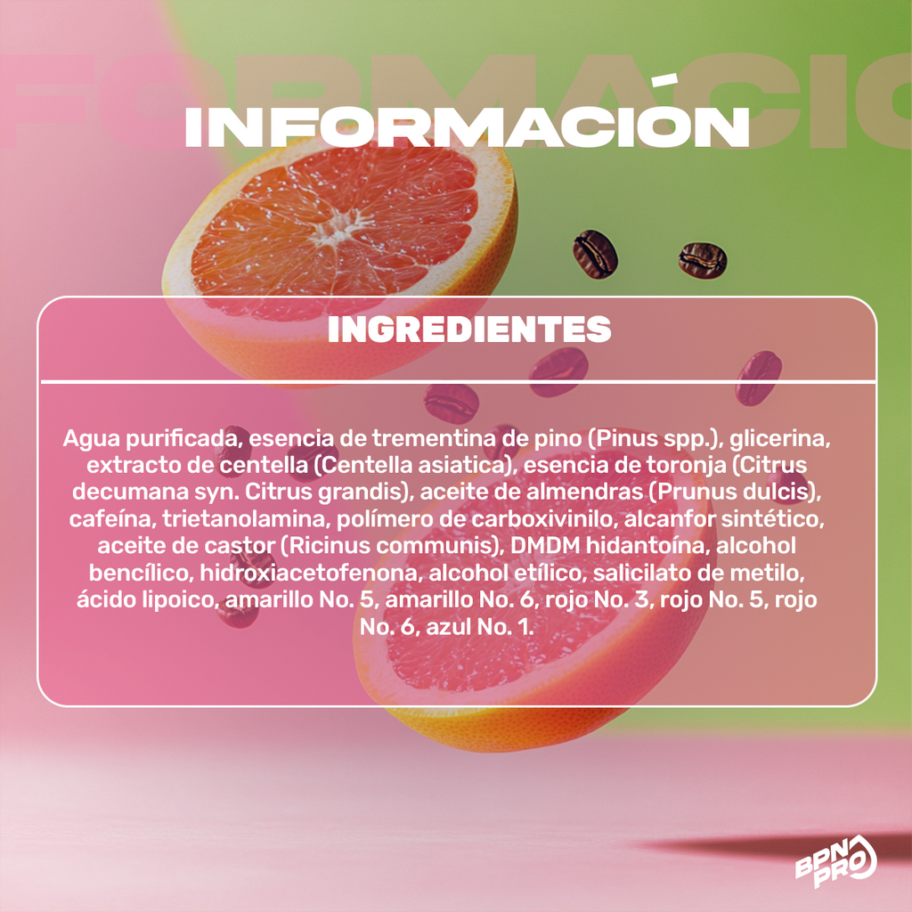 Tonifica, reduce, reafirma. Favorece la microcirculación y el drenaje linfático. Hidratación profunda. Textura ligera, de rápida absorción y aroma fresco. - Alivio de dolores e inflamaciones musculares y articulares. Efecto relajante y refrescante en la piel. Textura ligera y rápida absorción sin sensación grasosa. - Hidratación rápida y efectiva. Reposición de electrolitos clave (Potasio, Magnesio y Calcio). Apoya músculos y huesos. Reduce calambres.