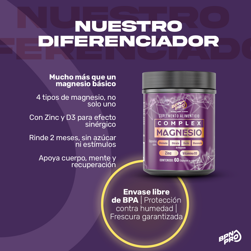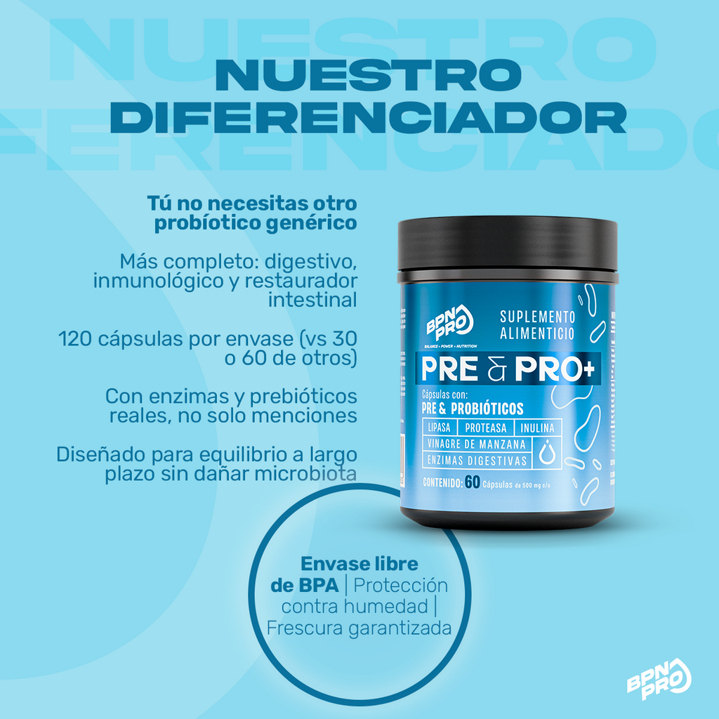 El Magnesio Complex BPN PRO combina cuatro tipos de magnesio (citrato, gluconato, glicinato y óxido) con zinc y vitamina D3 para mejorar tu bienestar físico y mental. Diseñado para quienes sufren estrés, fatiga o tensión muscular, favorece la relajación, el descanso y el rendimiento. Ideal para personas activas o con necesidades elevadas de minerales, ayuda a mantener huesos y músculos fuertes, mientras promueve energía constante y un sistema inmunológico equilibrado. El Pre&Pro BPN PRO combina 40 billones de probióticos multicepa y prebióticos como la inulina, además de enzimas digestivas naturales (lipasa, proteasa), papaya y vinagre de sidra de manzana, está formulado para mejorar la digestión y optimizar la absorción de nutrientes esenciales. ayuda a reducir la hinchazón y mejora el bienestar digestivo. Ideal para quienes buscan una flora intestinal equilibrada y un sistema digestivo saludable.