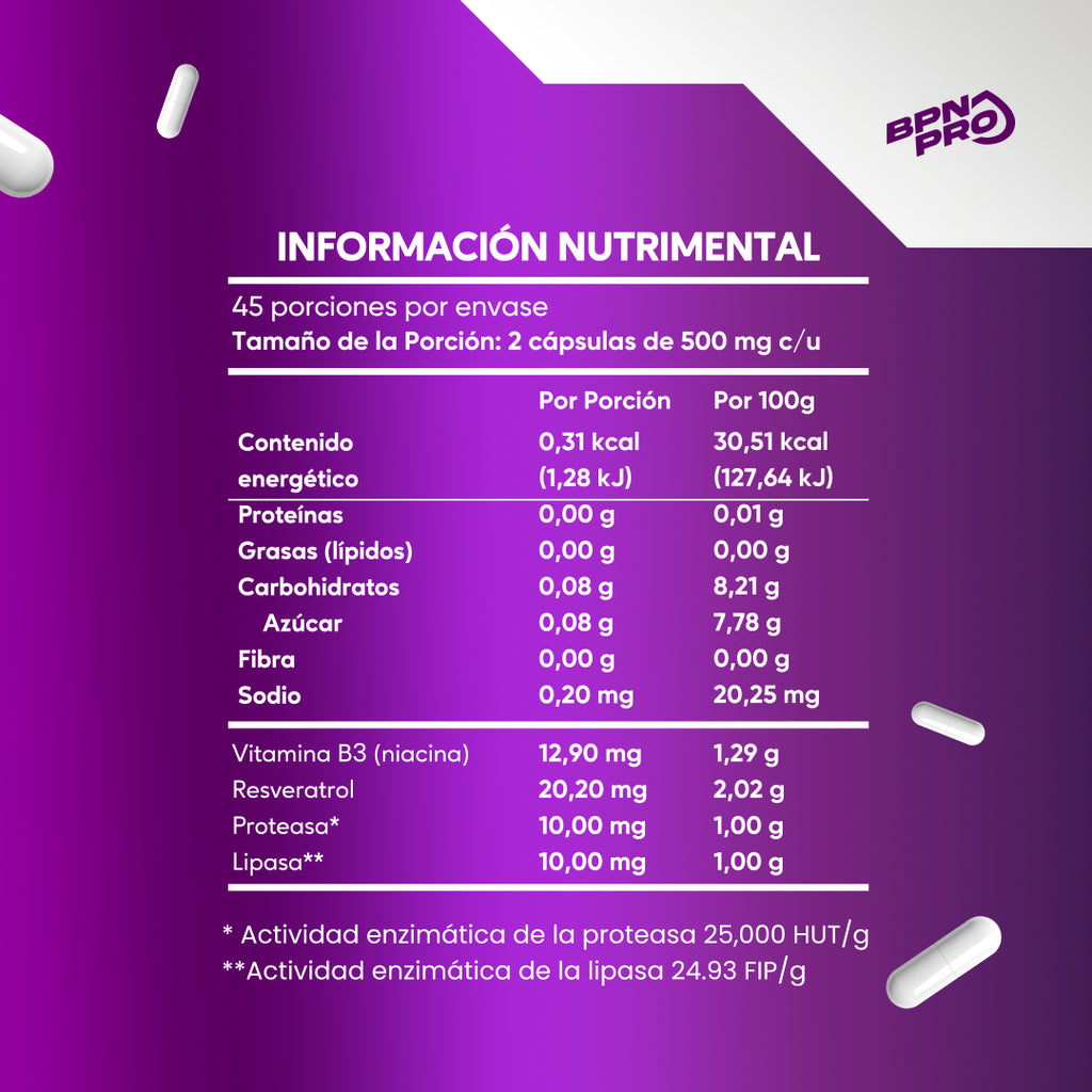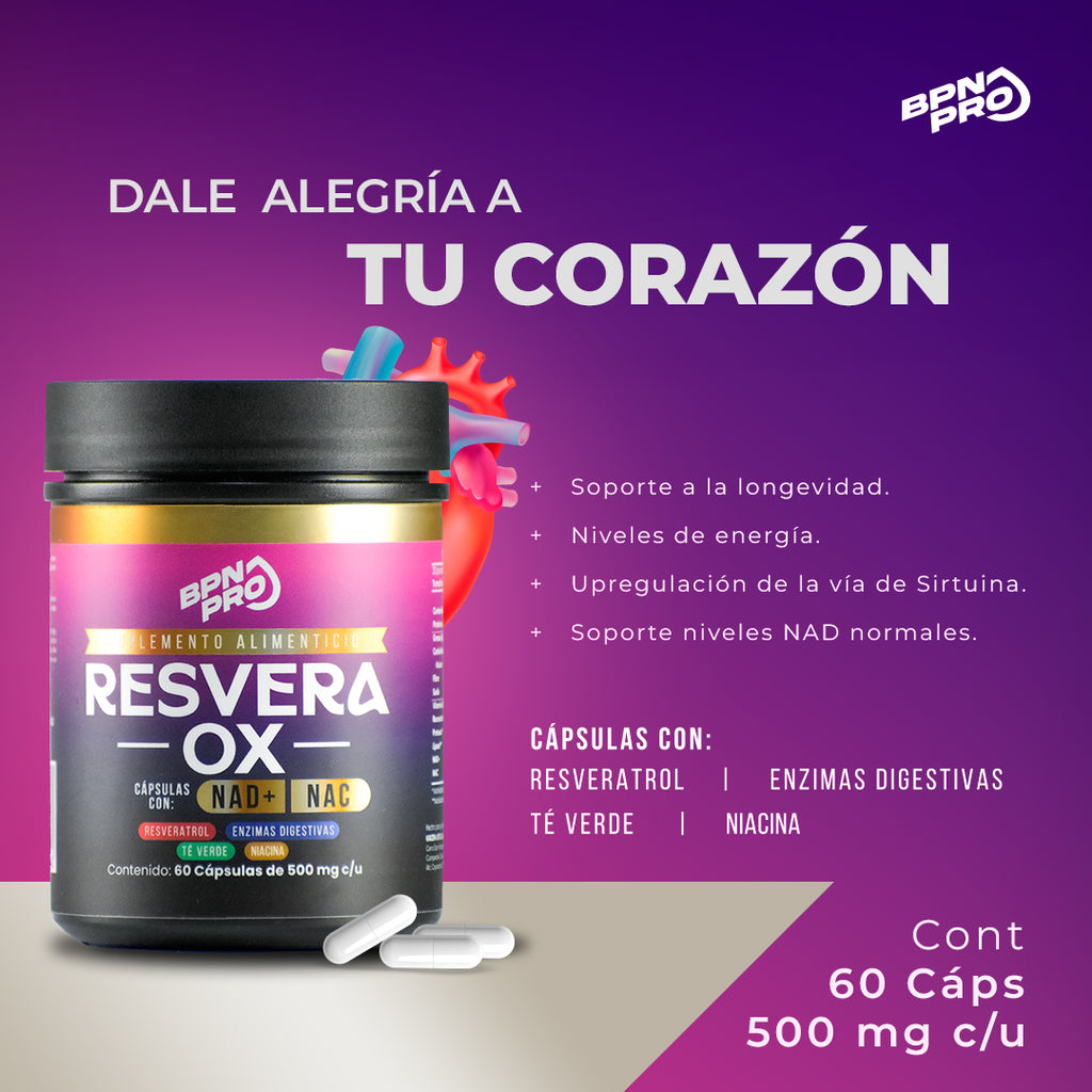 El HER Secret BPN PRO combina colágeno, biotina, ácido fólico, vitaminas C, E y complejo B, astaxantina, ácido hialurónico, coenzima Q10, selenio y zinc. Ayuda a fortalecer cabello y uñas, mejorar la hidratación de la piel y combatir el envejecimiento celular gracias a su contenido antioxidante. Además, apoya el metabolismo, el sistema inmune y la regeneración de tejidos de forma natural. El ResveraOx BPN PRO combina resveratrol, NAD+, NAC, enzimas digestivas, té verde y niacina. Apoya la salud celular, el metabolismo energético y el envejecimiento saludable. Su fórmula ayuda a combatir el estrés oxidativo, mejorar la claridad mental y promover una correcta absorción de nutrientes, ideal para personas que buscan vitalidad, rendimiento y bienestar integral.