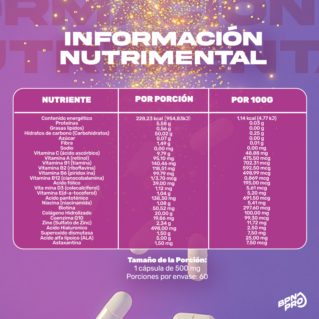 Fortalece cabello y uñas desde el interior. Mejora la apariencia e hidratación de la piel. Apoya la regeneración celular y el sistema inmune. Aporta antioxidantes. Contribuye al metabolismo y control de peso. Favorece la absorción de nutrientes. Contribuye a la desintoxicación y defensa antioxidante. Favorece el metabolismo, la absorción de nutrientes y la claridad mental. Apoya el envejecimiento saludable. Promueve la regeneración celular.